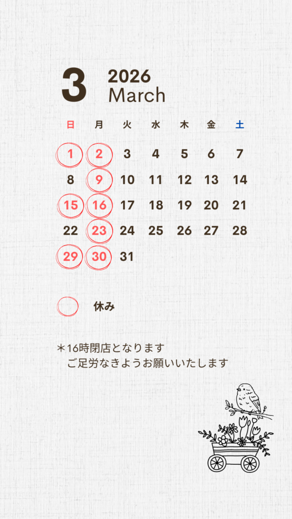 nagomuでは、基本毎週月曜日と第1・3・5日曜日を定休日とさせていただきますが、